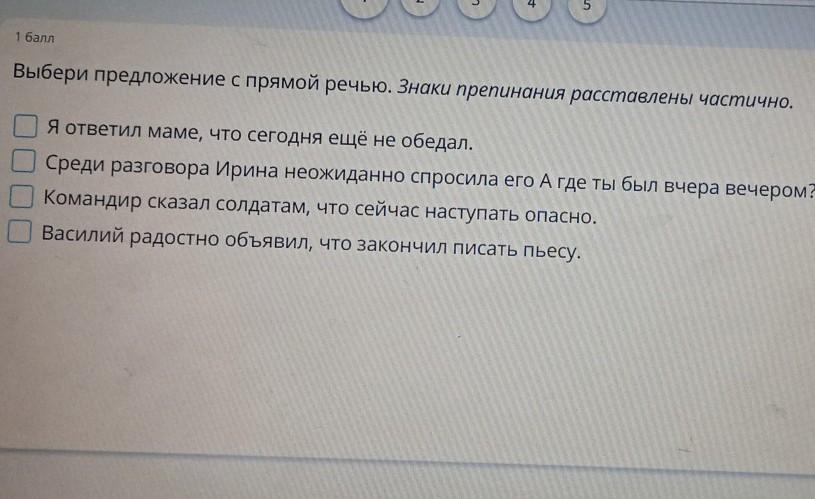 ge & я о оооо Выбери предложение с прямой речью. Знаки препинания расставлены частично. Я ответи маме, что сегоден еще не обедаль Среди разговора Ирина неожиданно спросила его Агде ты был вчера вечером? Командир сказал солдатам, что сейчас наступать опасно. Свакилий радостно объявил, что закончил писать пьесу. ОО Y