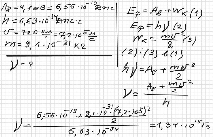 Робота виходу електронів з поверхні металу дорівнює 4, 1 еВ. Яка частота хвилі випромінювання, що спричиняє фотоефект, якщо максимальна швидкість фотоелектронів 720 км/с?