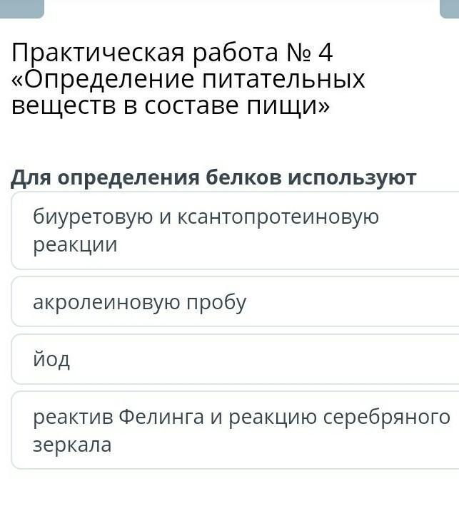 Для определения белков используют биуретовую и ксантопротеиновую реакции акролеиновую пробу йод реактив Фелинга и реакцию серебряного зеркала СРОЧНО ПЖ