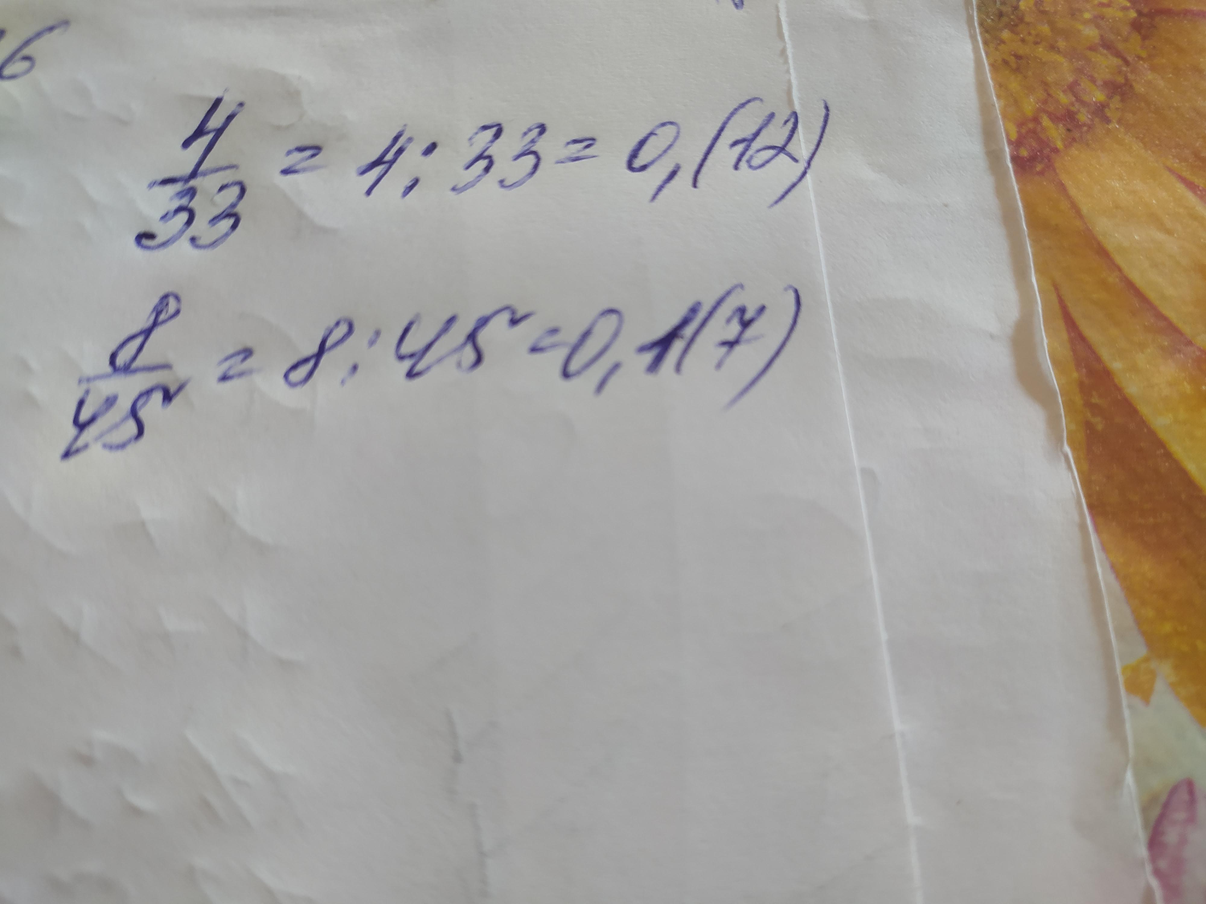 Представьте переодической десятичной дробью следующие дроби: а) 4/33 б)8/45