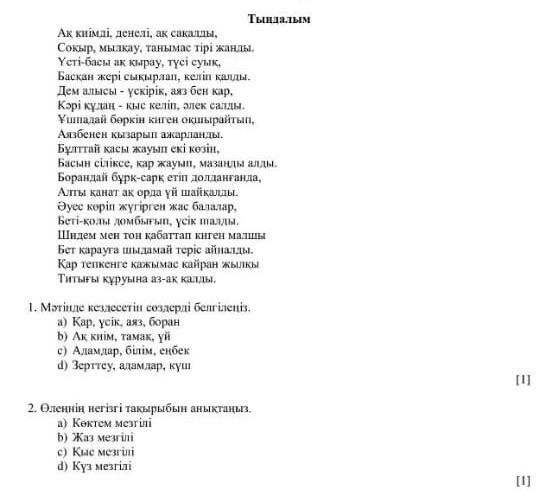 2. Олеңнің негізгі тақырыбын анықтаңыз. а) Кектем мезгілі Б) Жаз мезгілі c) Қыс мезгілі d) Күз мезгілі