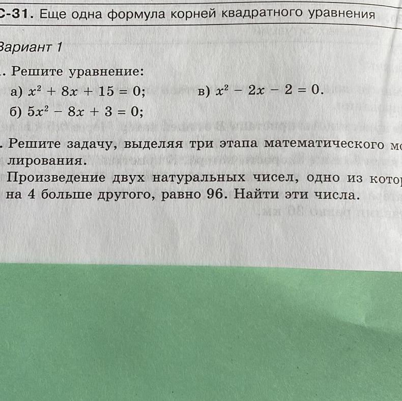 а) D=8*8-4*15*1=4, корень из 4=2, тогда х1,2= (-8+-4)/2*1, тут решаете один с плюсом, а один с минусом.