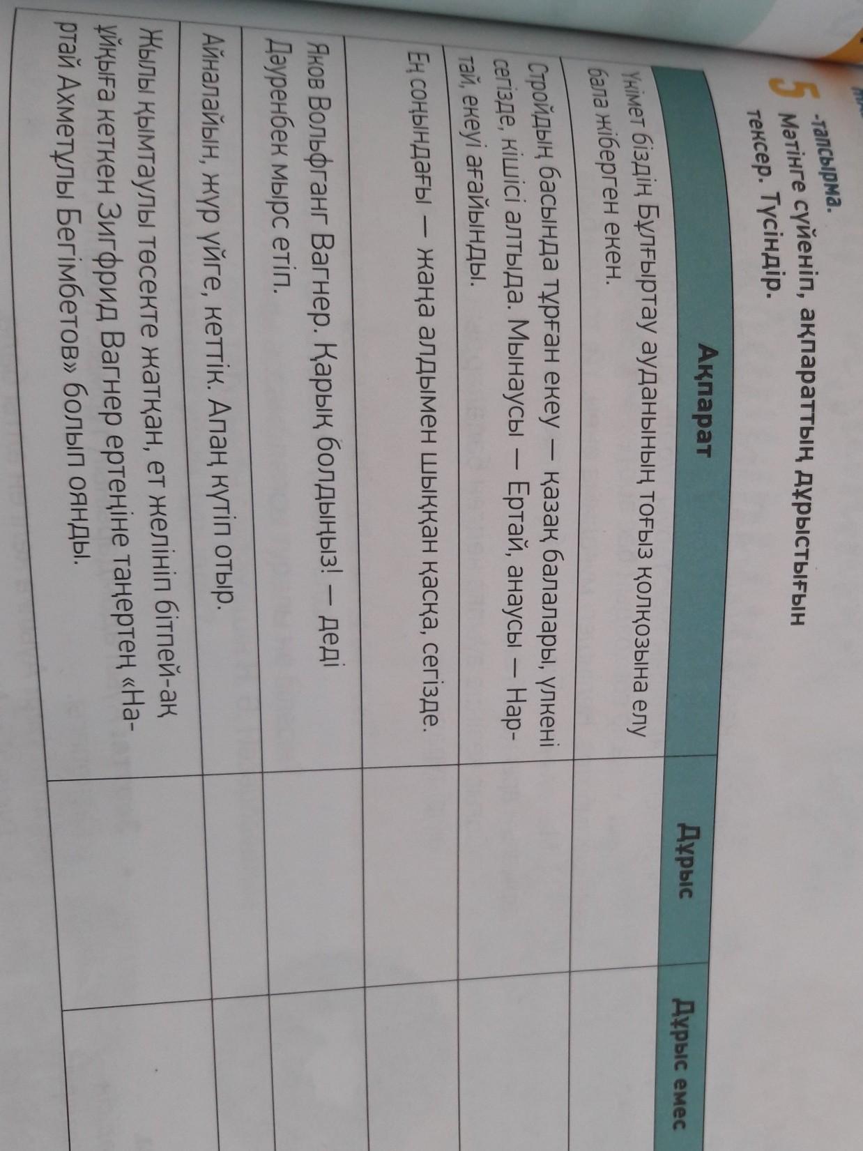 Мəтінге сүйеніп,ақпараттың дұрыстығын тексер.Тусіндір Үкімет біздің бұлғыртау ауданың тоғыз қолқозына елу бала жіберген екен.