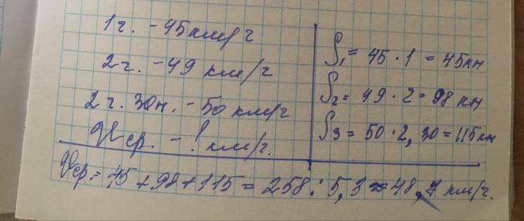 3. Первые 2 часа грузовик ехал со скоростью 45 к/ч, следукший час — со скоростью 49 км/ч, а затем 2 часа 30 минут — со скоростью 50 км/ч. Найдите средното скорость автомобиля на протяжении всего пути. Ответ дайте в км/ч.