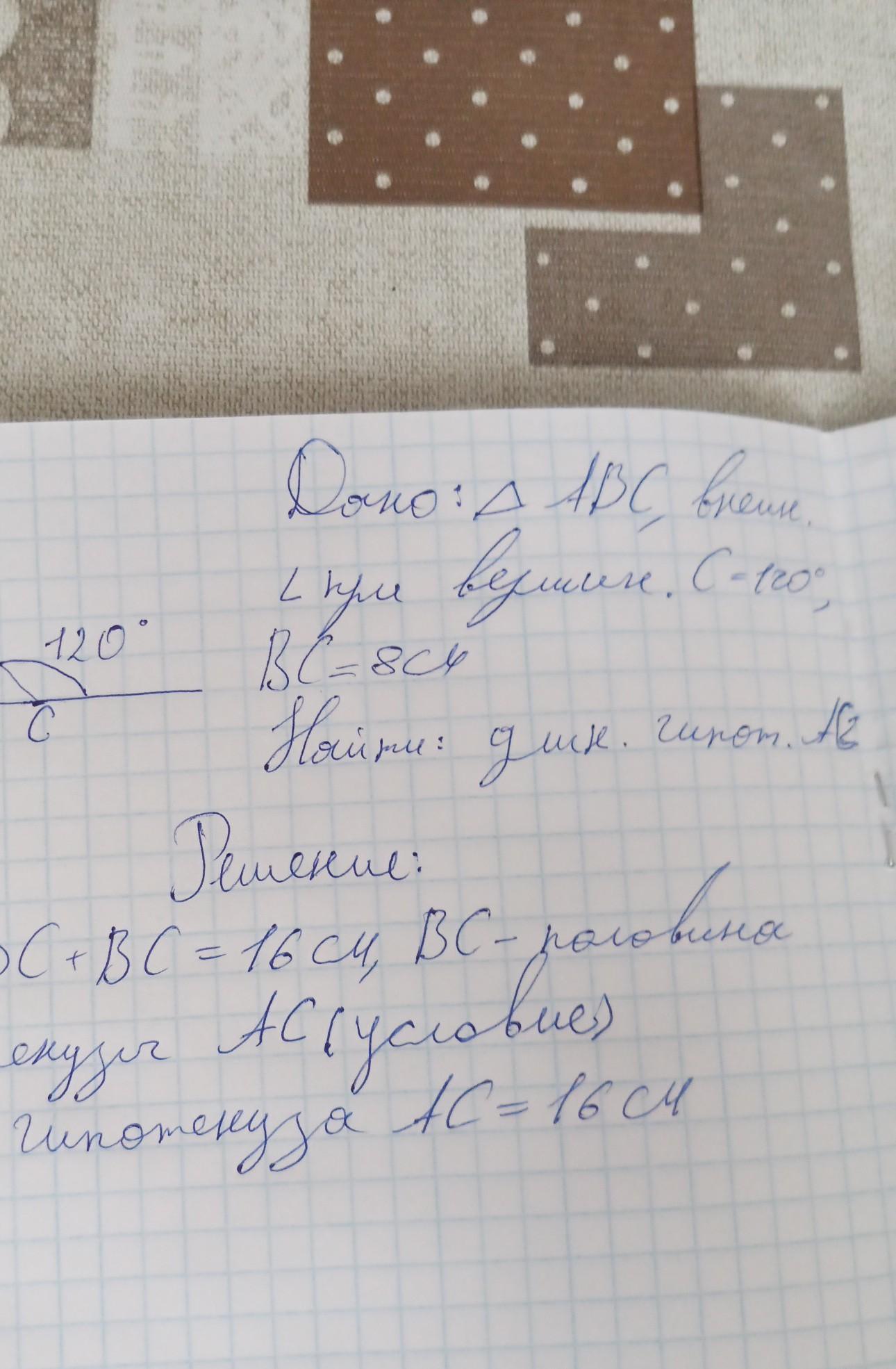 В прямом треугольнике ABC с гипотенузой АС внешний угол при вершине C равен 120 градусам BC равно 8 см Найдите длину гипотенузы треугольника