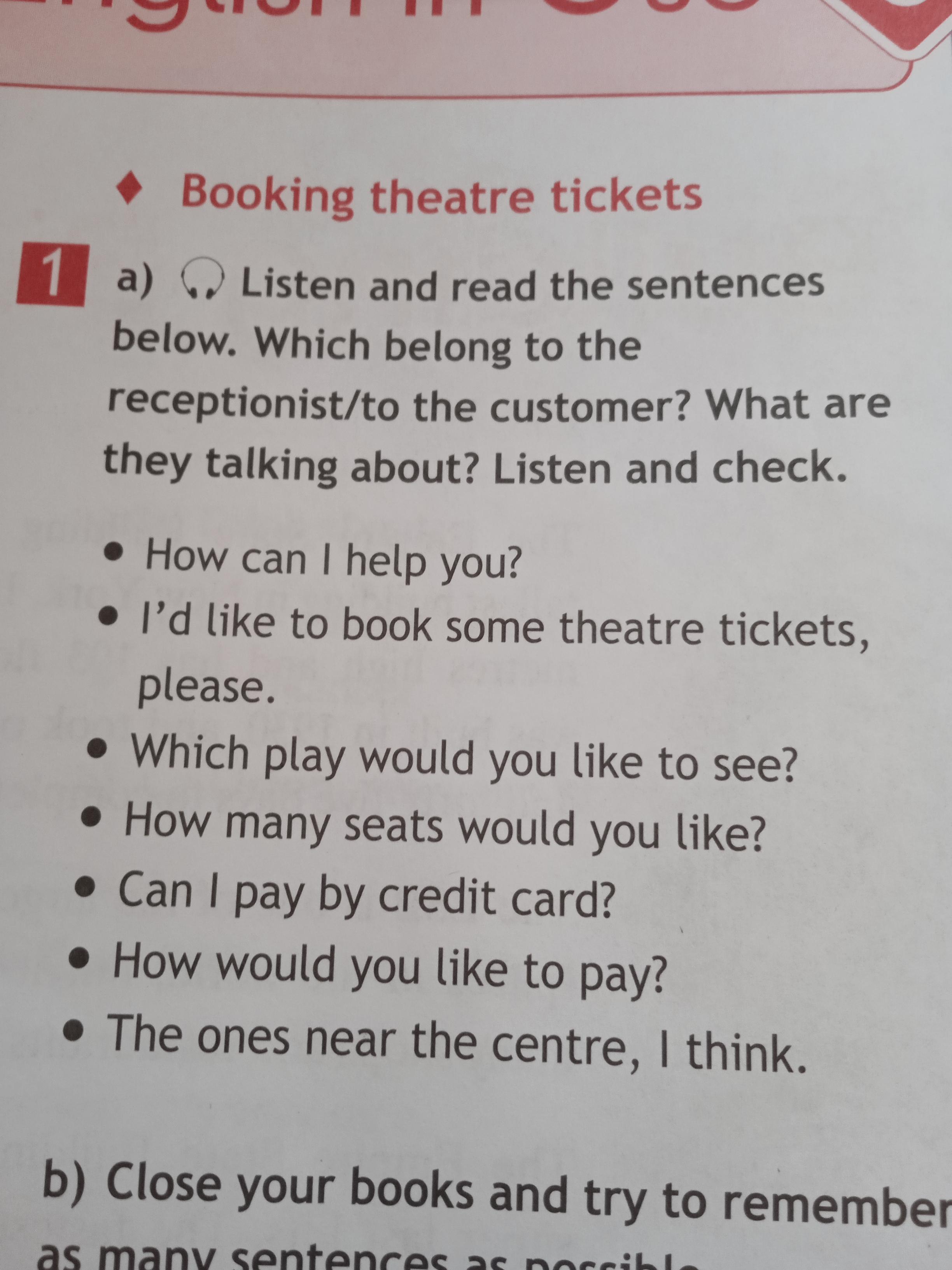 • Чем я могу вам помочь? • Я хотел бы заказать билеты в театр, 1. пожалуйста. • Какой спектакль вы хотели бы посмотреть? • Сколько мест вы хотите? • Могу я заплатить кредитной картой? • Как бы вы хотели расплатиться? • Те, что ближе к центру, я думаю.