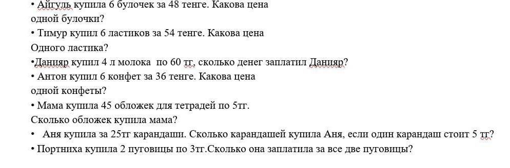 1) 8 тенге 2) 9 тенге 3) 240 тенге 4) 6 тенге 5) 45 обложек 6) 5 карандашей 7) 6 тенге