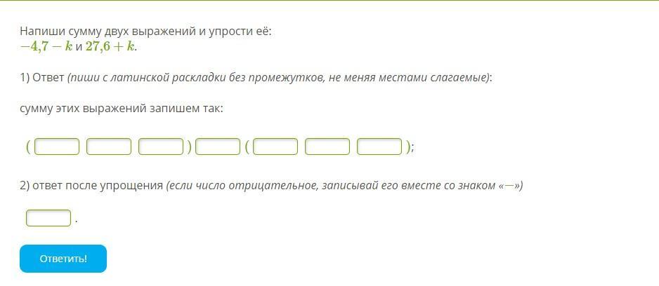 (-4,7 - k) + (27,6 + k) = -4,7 - k + 27,6 + k = 22,9 (+k и -k сокращаются)
