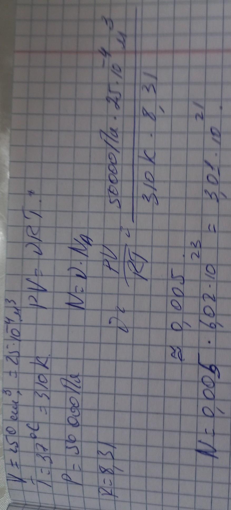 Сколько молекул газа содержится в колбе объёмом 250 см3, если при температуре 37 градусов Цельсия его давление составляет 50кПа?