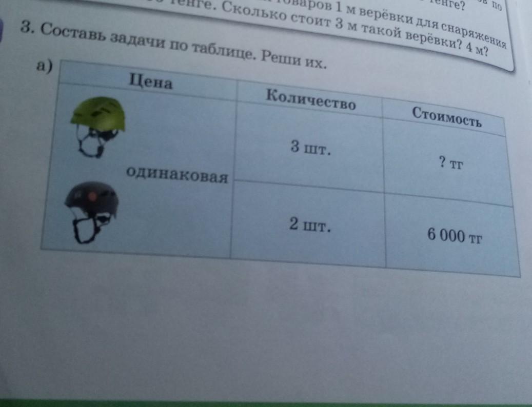 4 м? 3. Составь задачи по таблице. Реши их. a) Цена Количество Стоимость 3 шт. ? тг одинаковая 2 шт. 6 000 тг