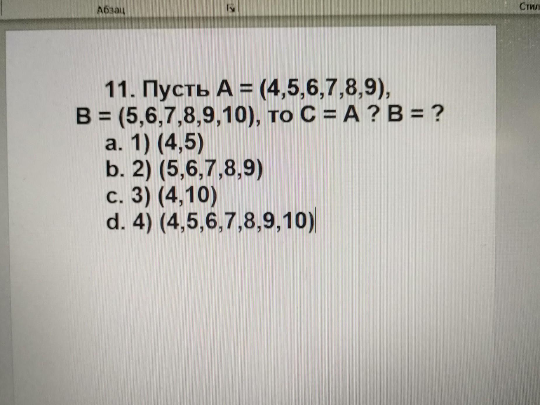 C = A ∩ B = { 5,6,7,8,9 } . В - дь : b. 2) { 5,6,7,8,9 } .