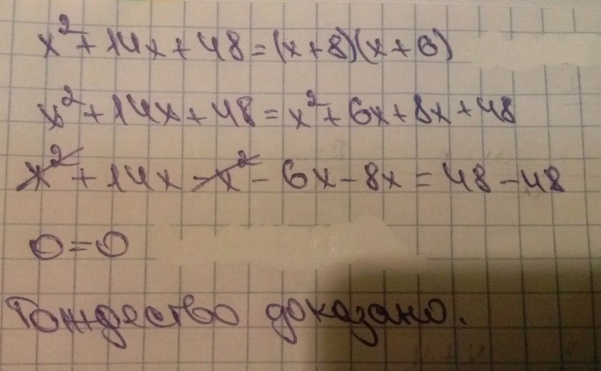 4)Докажите тождество х(во второй степени) + 14х + 48 = (х + 8)(х + 6)
