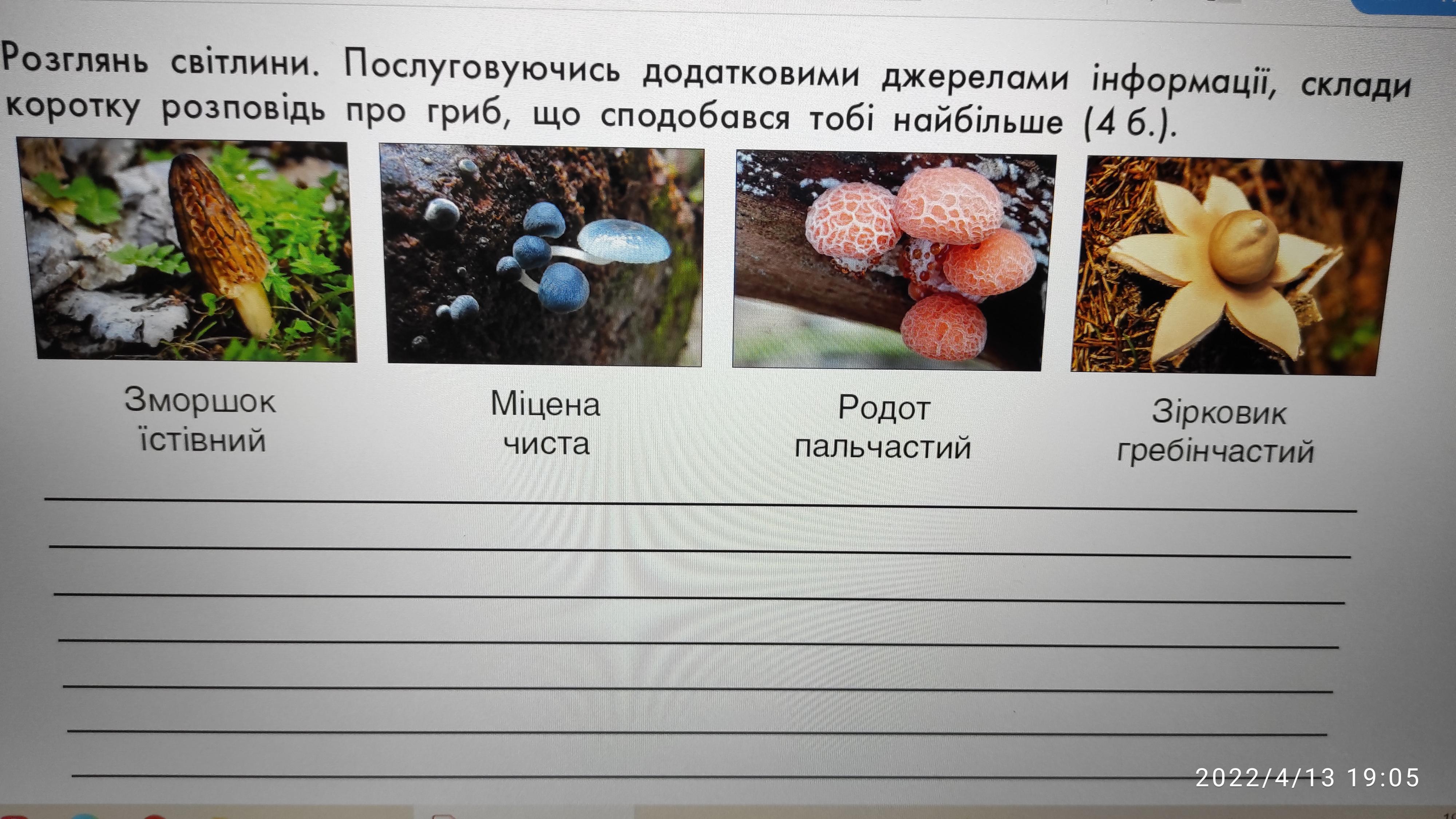 1. Розглянь світлини. Послуговуючись додатковими джерелами інформації, склади коротку розповідь про гриб, що сподобався тобі найбільше (4 б.). СКЛАДІТЬ ПРО МІЦЕНУ ЧИСТУ. ПЛІІІЗ