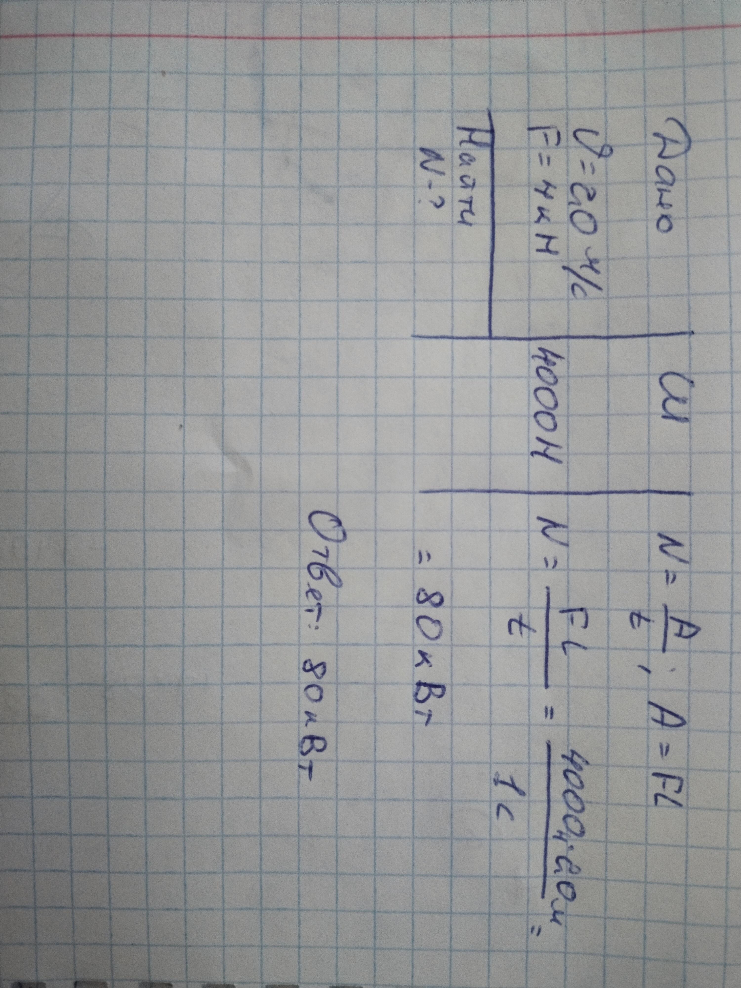 P = FV = 4 000 Н * 20 м/с = 80 кВт.