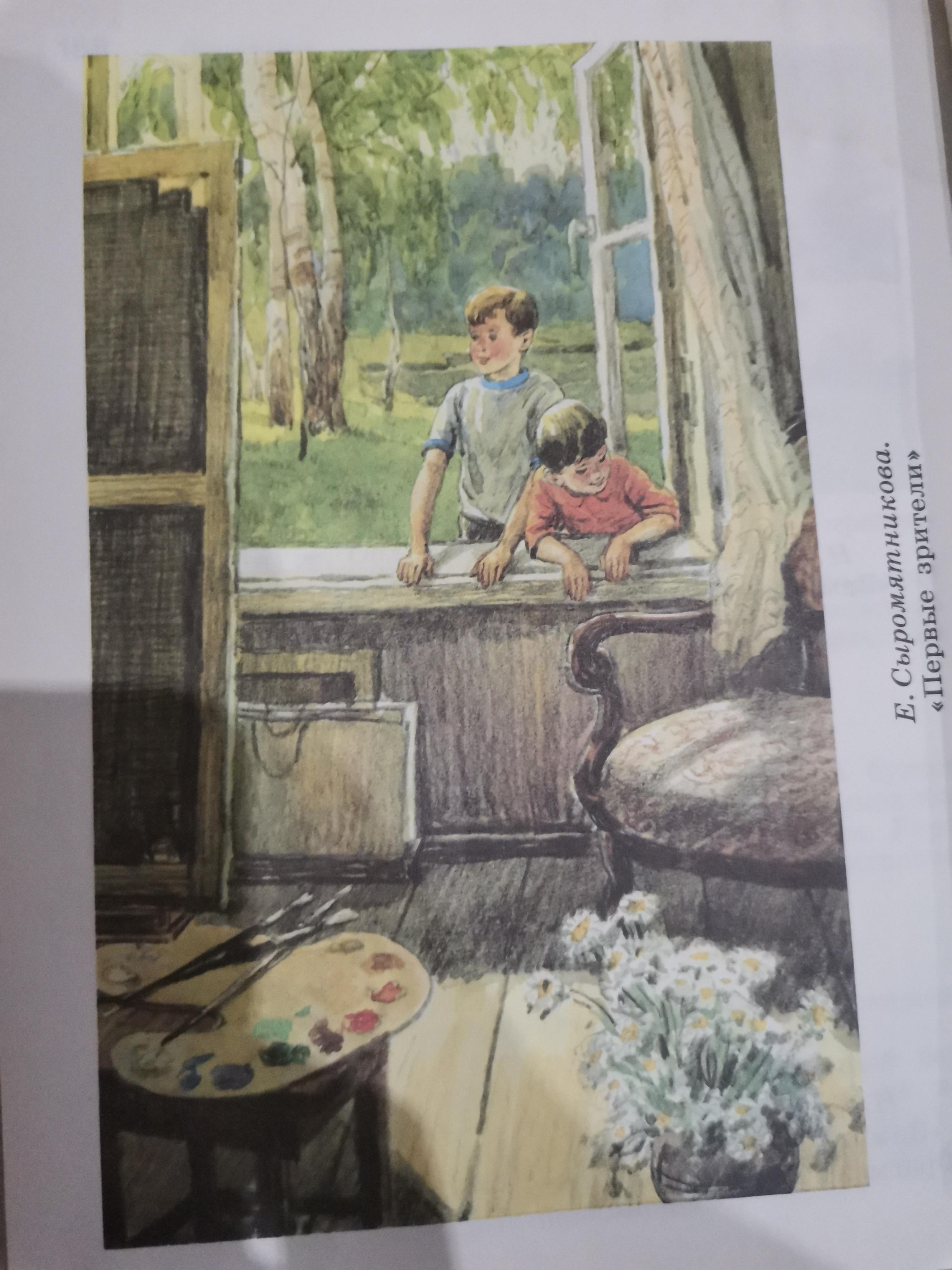 Художница Сыромятникова Екатерина Васильевна в своей картине «Первые зрители» объединила несколько жанров живописи. Это и пейзаж, который виден за окном, и портрет двух мальчиков, и натюрморт из полевых ромашек.