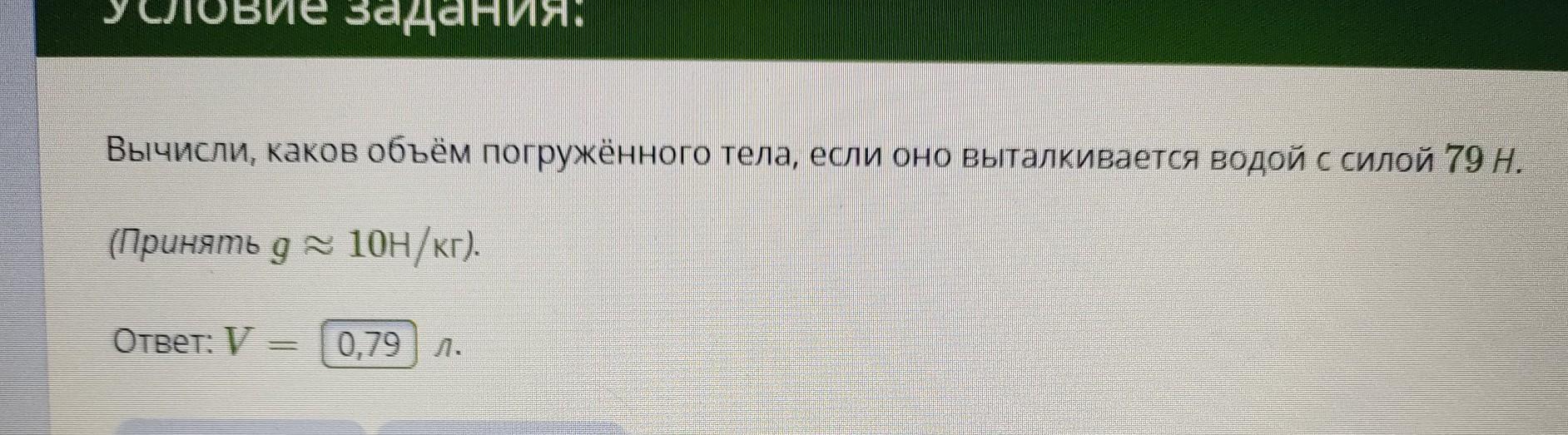 Вычисли, каков объём погружённого тела, если оно выталкивается водой с силой 79 Н. (Принять g 10н/кг). Ответ: у л.