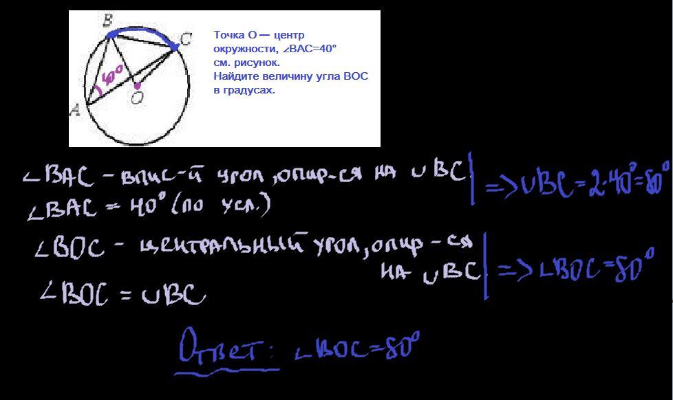 Точка О — центр окружности, ∠BAC=40° (см. рисунок). Найдите величину угла BOC (в градусах).
