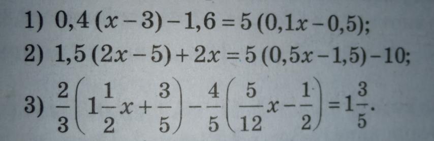 1)0,4(х-3)-1,6=5(0,1x-0,5)
