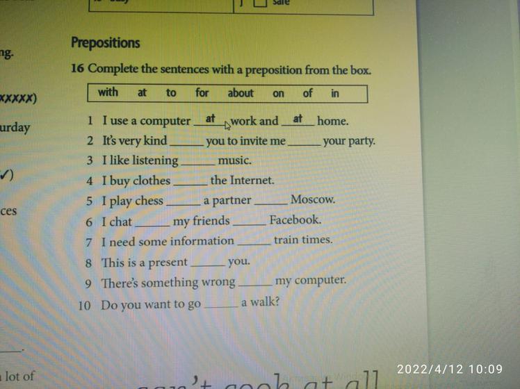 2 of. to 3.to 4.in 5.with, in 6.with, on 7.about 8.for 9.with 10.for
