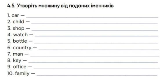 1Car-cars 2. child - children 3.shop - shops 4.watch-watches 5. bottle- bottles 6.country- countries 7.man - men 8.key-keys 9.office-offices 10.family - families.