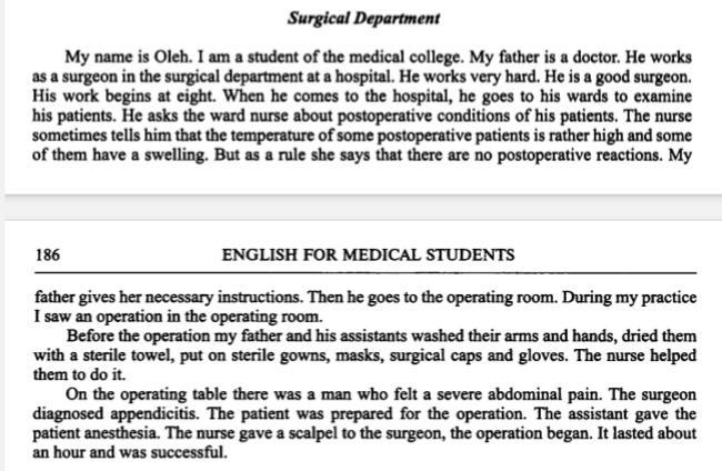 Меня зовут Олег. Я студент медицинского колледжа. Мой отец доктор. Работает хирургом в хирургическом отделении больницы. Он работает очень усердно. Он хороший хирург. Его работа начинается в восемь. Когда он приходит в больницу, он идет в свои палаты, чтобы осмотреть своих пациентов. Он расспрашивает палатную медсестру о послеоперационном состоянии своих пациентов. Медсестра иногда говорит ему, что у некоторых послеоперационных больных довольно высокая температура и у некоторых отек. Но как правило она говорит, что послеоперационных реакций нет. Мой