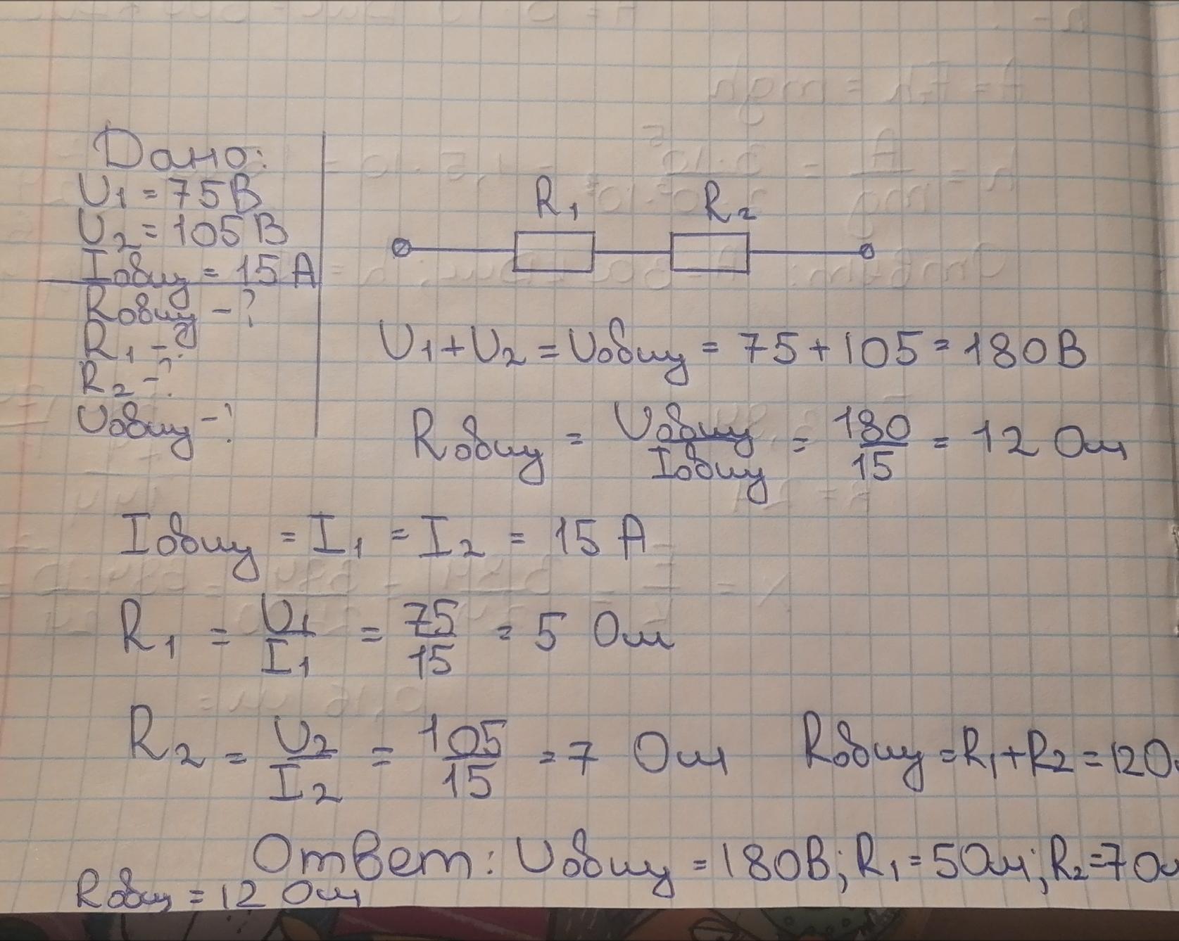 два резистора соединены последоватьно. Напряжение на первом резисторе 75 В, на втором 105 В. Сила тока на всем участке цепи составляет 15 А. найти общее сопротивление, сопротивление каждого резистора, и сопротивление во всей цепи. со схемой