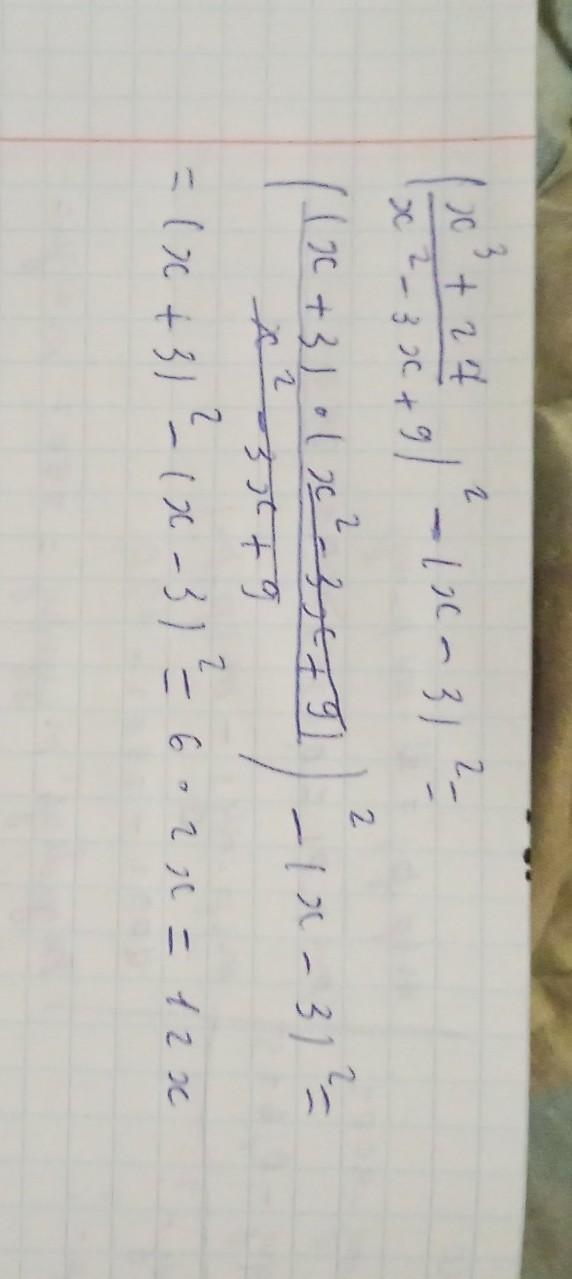 (x³+27/x²-3x+9) ²-(x-3)²=((x+3) ×(x²-3x+9) /x²-3x+9)) ²-(x-3) ²=(x+3)²-(x-3) ²=6×2×