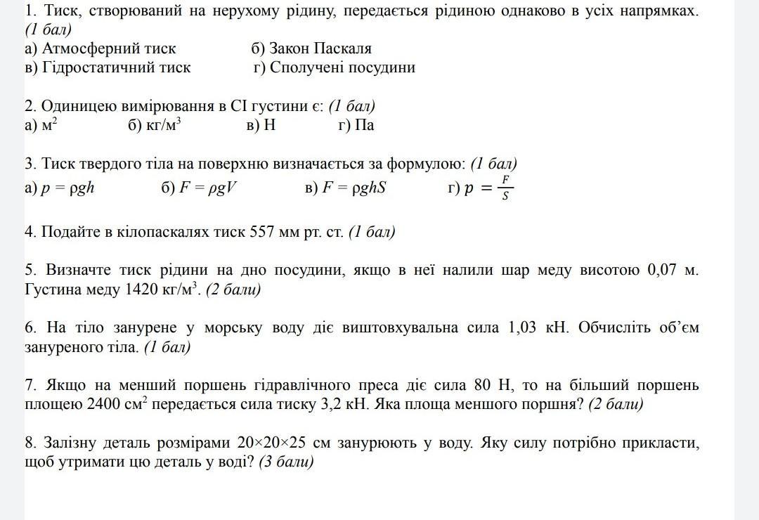 8.Fарх=Fтяж=рв*g*V=7800*10*20*20*25*10^(-6)=780Н щоб цю деталь втопити, потрібно щоб F=Fтяж - Fарх = (ро заліза - ро води)*g*V=(7800-1000)*10*20*20*25*10^(-6)=680Н
