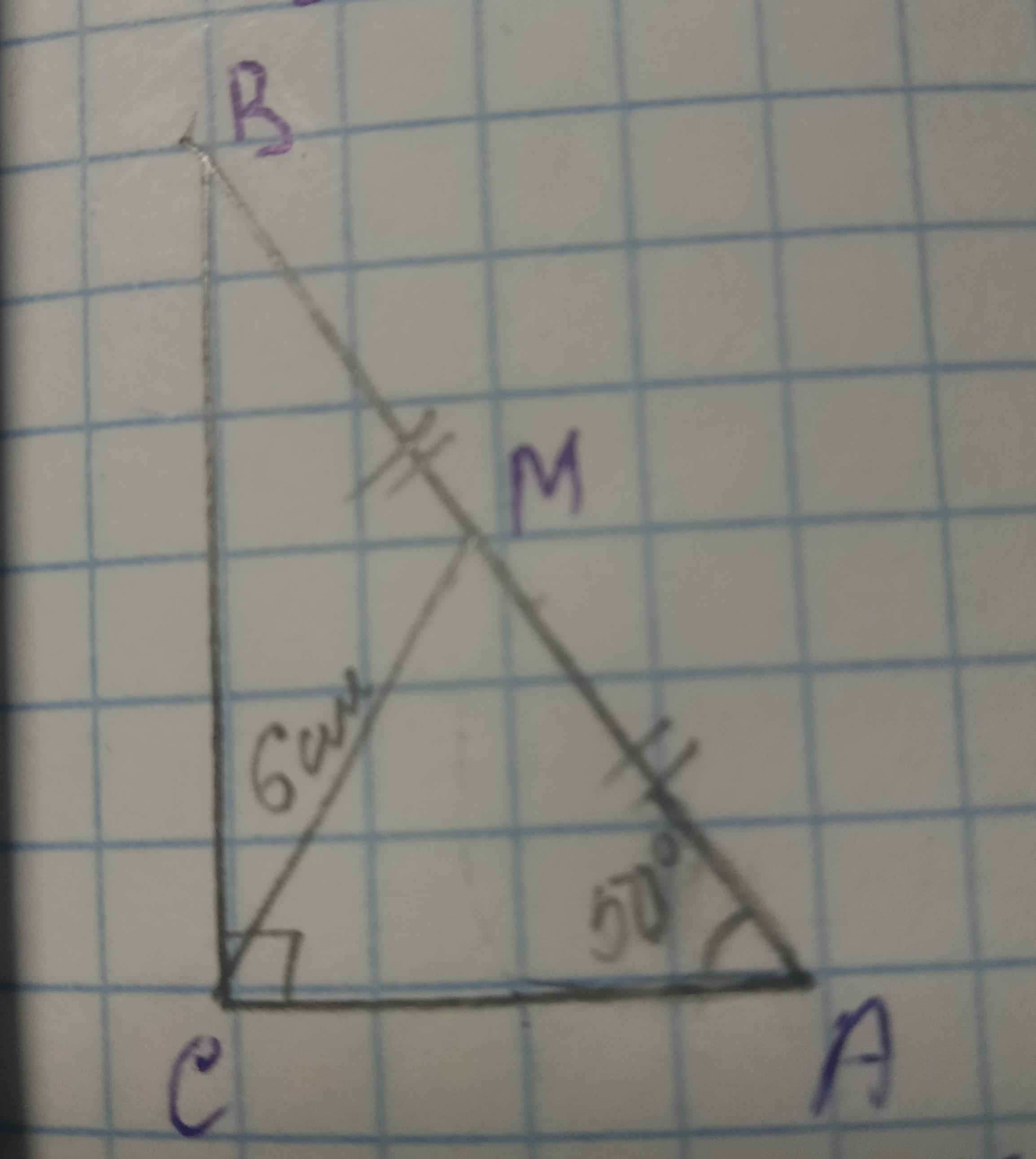 у вас дан угол ВСА, он равен 90°, СМ - медиана, проведенная к гипотенузе, поэтому ВМ=АМ=СМ=6см, коль так, то треугольники ВМС и АМС равнобедренные, с основаниями соответственно ВС и АС, поэтому углы при основании равны, т.о., интересующие вас углы можно найти так:
