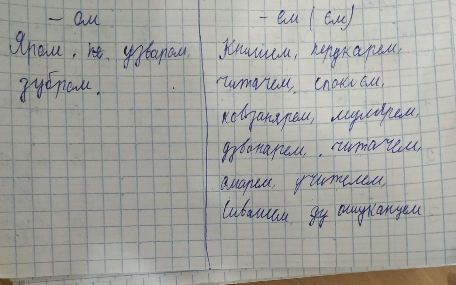 Вправа2. Іменники поставте в орудному відмінку однини й запишіть у дві колонки: 1) із закінченням –ом; 2) із закінченням –ем (-єм). Іменників із закінченням –им не виписуйте.