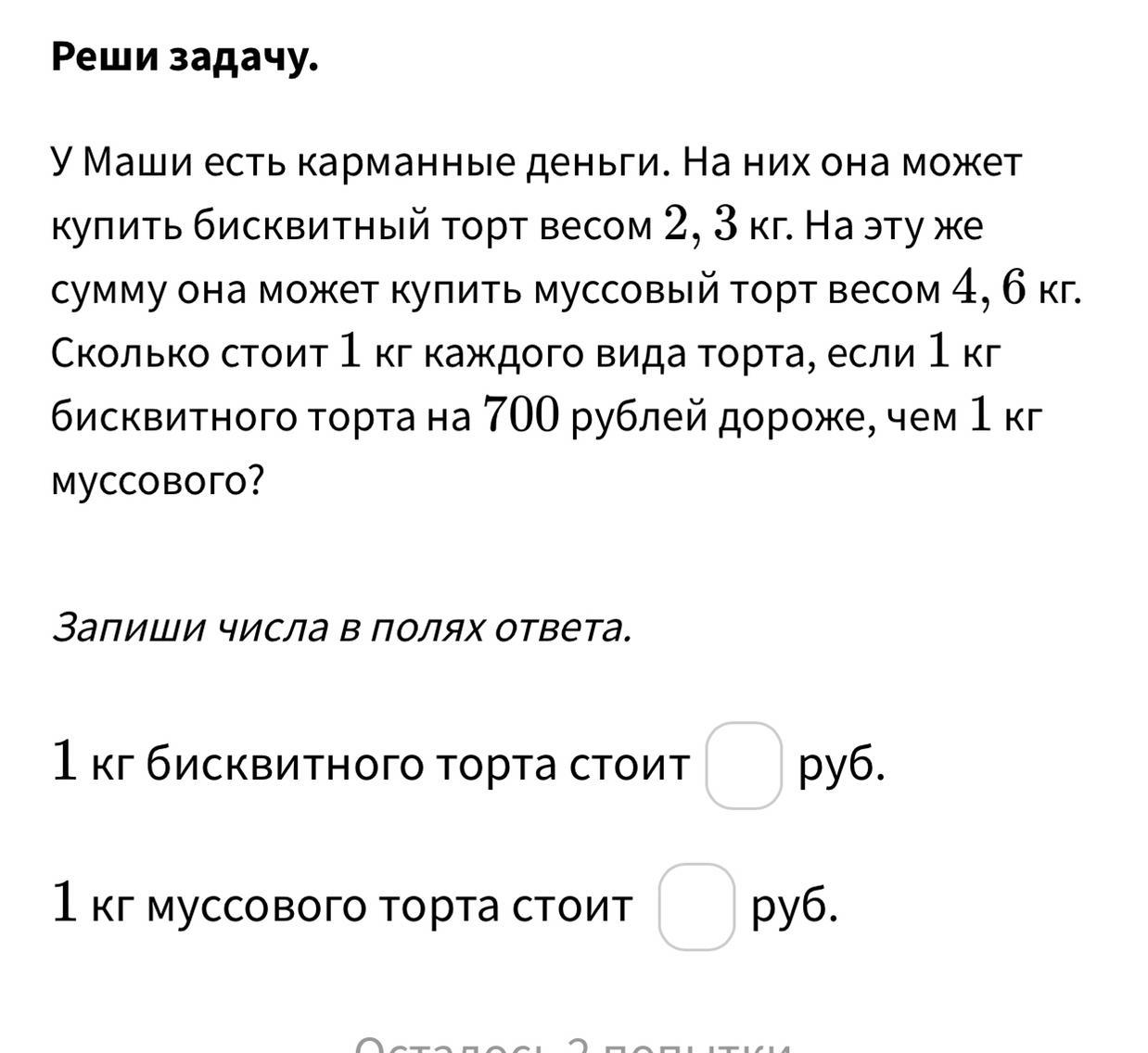 Пошаговое объяснение: кг бисквитного торта стоит 1400, а кг массового торта 700
