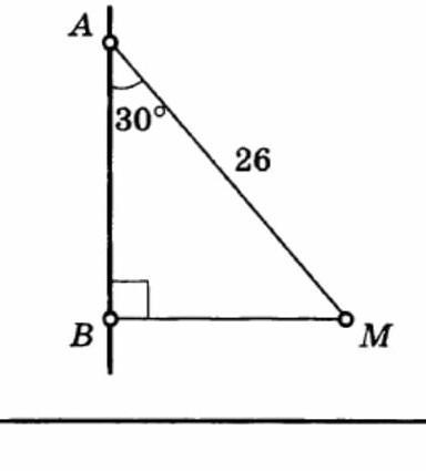 Катет, лежащий напротив 30 градусов = половине гипотенузы. Т.к. требуется найти расстояние от точки до прямой (т.е. кратчайшее расстояние т.е. перпендикуляр), то есть катет ВМ, то он будет = половине от 26. Ответ 13