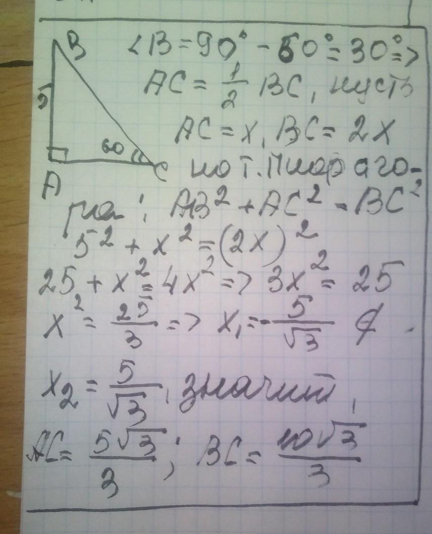 в прямоугольном треугольнике АВС, <А=90•, АВ=5 см и <С=60•. Найдите АС и ВС