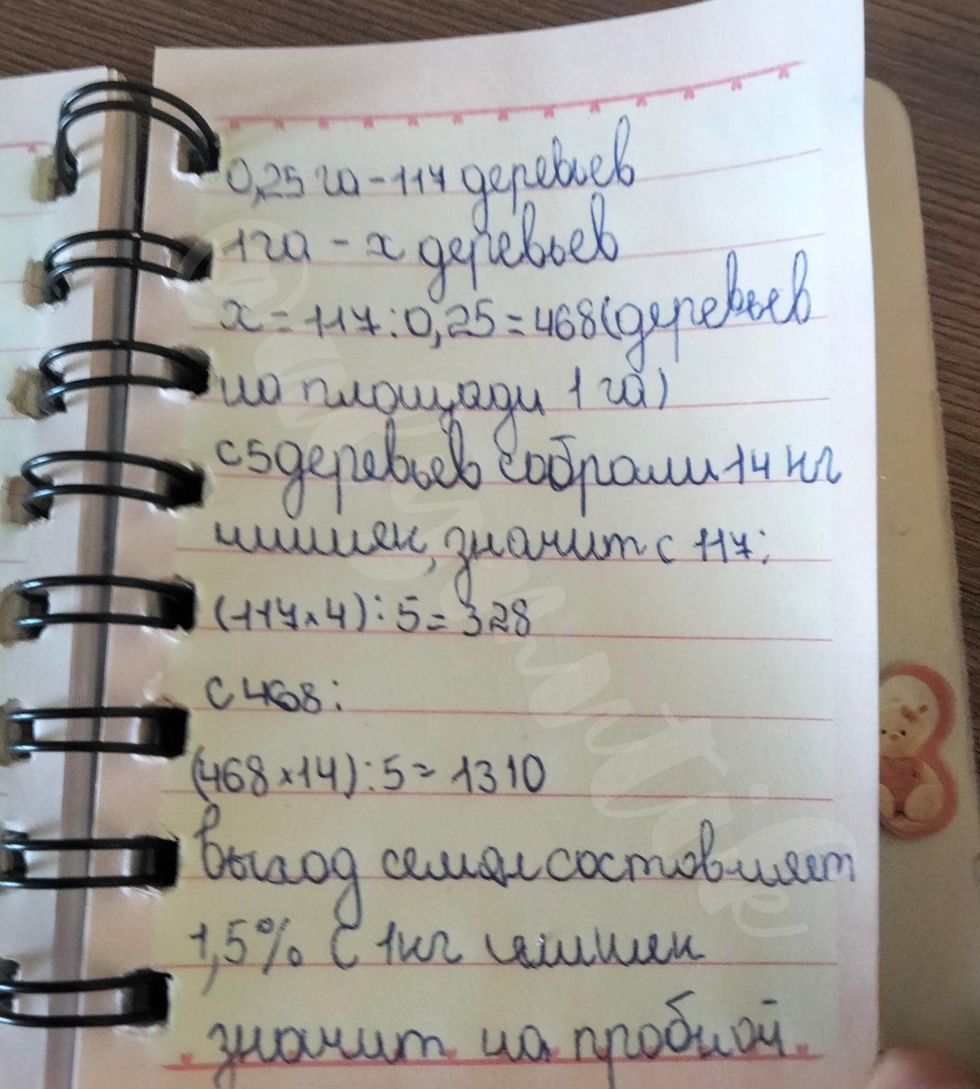 С пяти модельных деревьев лиственницы сибирской, срубленных на пробной площади 0,25 га, собрали 13 кг шишек. Определите урожай семян на пробной площади и на 1 га, если по перечёту на пробе 102 дерева, а выход чистых семян составляет 5 %.