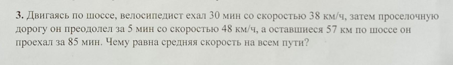 3. Двигаясь по шоссе, велосипедист ехал 30 мин со скоростью 38 км/ч, затем проселочную дорогу он преодолел за 5 мин со скоростью 48 км/ч, а оставшиеся 57 км по шоссе он проехал за 85 мин. Чему равна средняя скорость на всем пути?