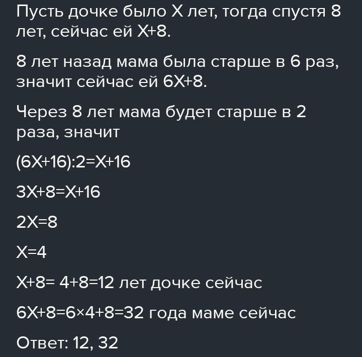 Восемь лет назад я был старше вас в 6 раз, а спустя восемь лет я был старше вас всего в два раза Сколько лет матери и дочери?