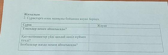 Жазылым 2. Сұрақтарға өлең мазмұны бойынша жауап беріңіз. Жауап Сұрақ Үлкендер немен айналысады? Қыз-келіншектер үйді қандай көңіл күймен тігеді? Бозбалалар жазда немен айналысады?