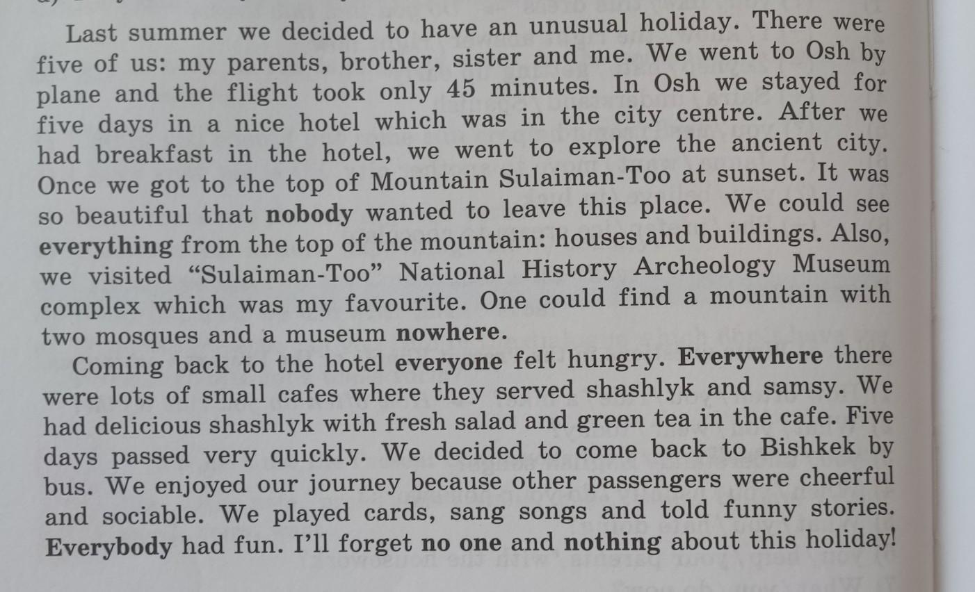 ласт самер ви десАйдед ту хев ен аньюжуал холидэй. зере вере файв оф ас: май перентс, брозер, систер энд ми. ви вент ту ош бай плэйн енд зе флайт тук онли форти файв мИнэтс. ин ош ви стейд фор файв дейс ин э найс хотэл вич воз ин э сити сентр. афтер ви хед брекфест ин зе хотэл, ви вент ту эксплор зе ейншент сити. вонс ви гад ту зе топ оф маунтен сулайман-ту ет сансет. ит вос соу бьютифул зет ноубади вонтед ту лив зис плейс. ви куд си эверисинг фром зе тап оф зе маунтейн: хаусес энд билдингс. олсо, ви визидет «сулейман-ту» нешенал хистори археолоджи мьюзем комплекс вич воз май фейворит. ван куд фанд е маунтейн виз ту москвиз енд э мьюзием ноувере.