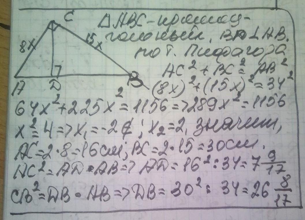 катеты прямоугольного треугольника относятся как 8:15, а гипотенуза равна 34 см. Найдите отрезки на которые гипотенуза делится высотой проведенной из вершины прямого угла