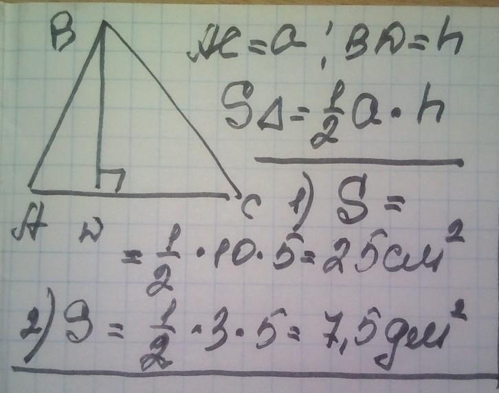 940. Сторона трикутника дорівнює а, h - висота, про ведена до цiєї сторони. Знайдіть площу трикутника, якщо: 1) а = 10 см, h = 5 см; 2) а = 3 дм, h = 5 дм.