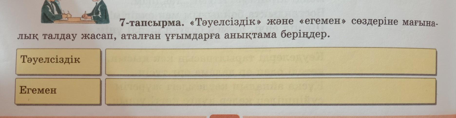 7-тапсырма. «Тәуелсіздік» және «егемен» сөздеріне мағыналық талдау жасап, аталған ұғымдарға анықтама беріңдер. Тәуелсіздік Егемен