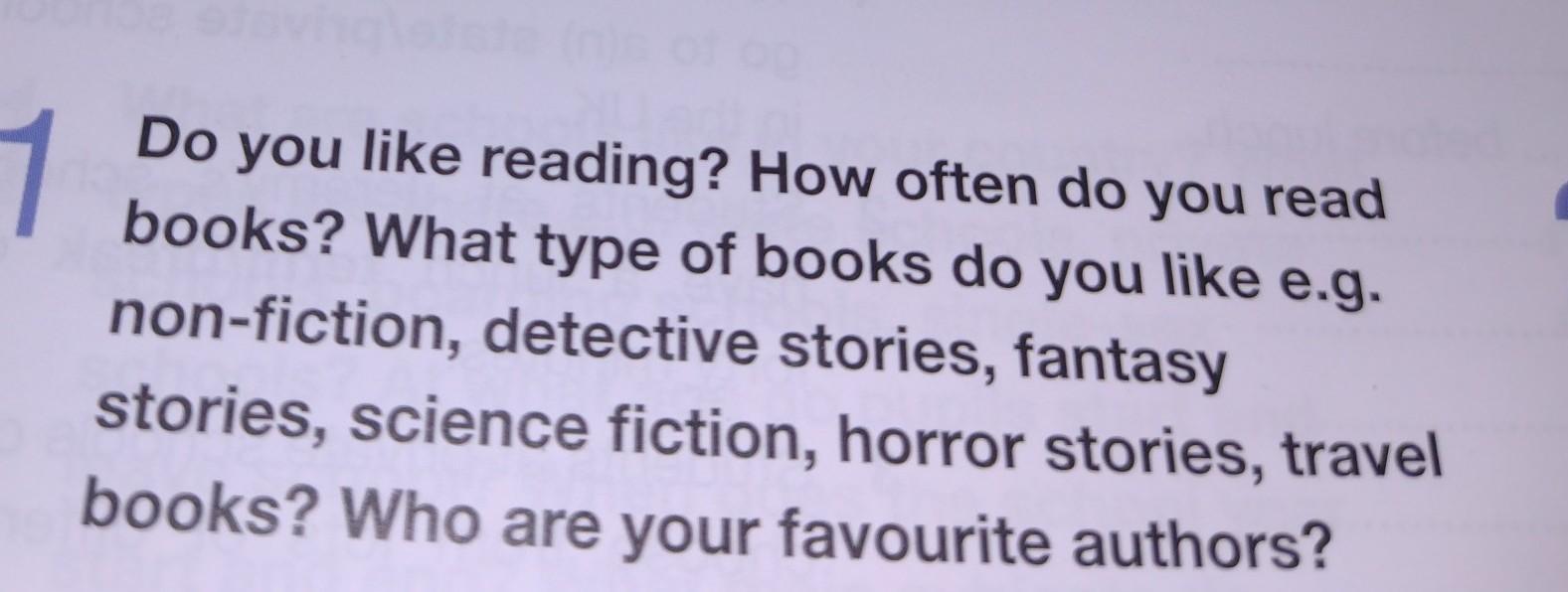 Yes, I do. I usually reading books after school. My favourite type of books is fantasy stories, because they are very excited. My favourite authors are J. K. Rowling and J. Tolkien.