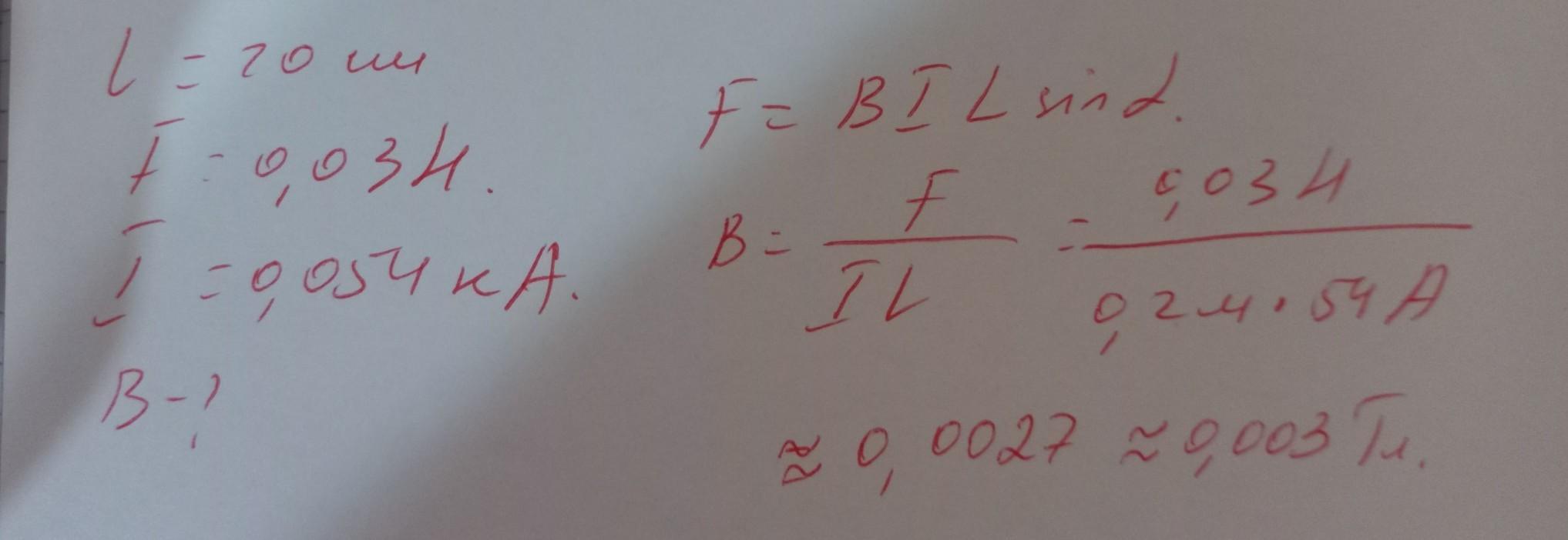 срочнооо определить индукцию магнитного поля если длина проводника 20 см а сила 0,03 Н при силе тока 0,054 кА