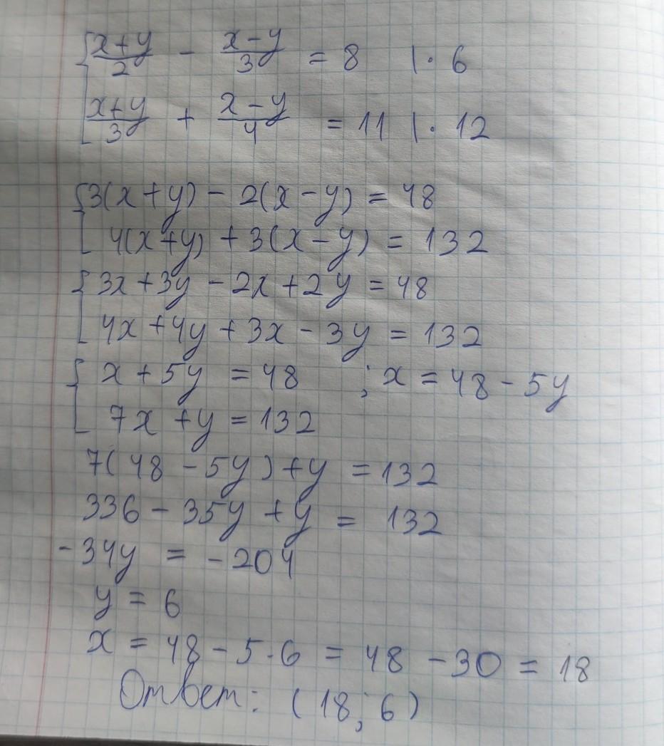 В первом шагу приведение к общему знаменателю по сути, но я сразу умножил на наименьшее кратное в обоих уравнениях, дальше стандартное решение
