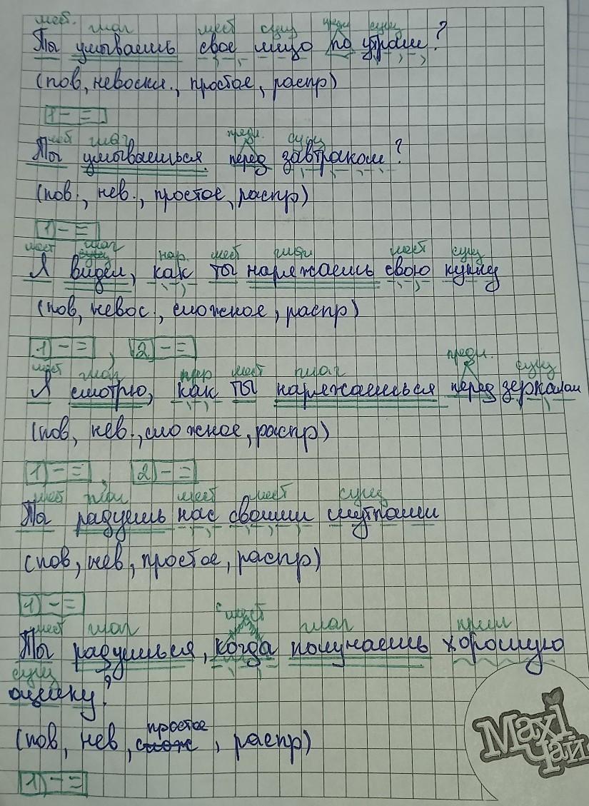 синтаксический разбор предложений., "ты умываешь свое лицо по утрам? Ты умываешься перед завтраком? Я видел, как ты наряжаешь свою куклу. Я смотрю, как ты наряжаешься перед зеркалом. Ты радуешь нас своими шутками. Ты радуешься когда получаешь хорошую оценку?