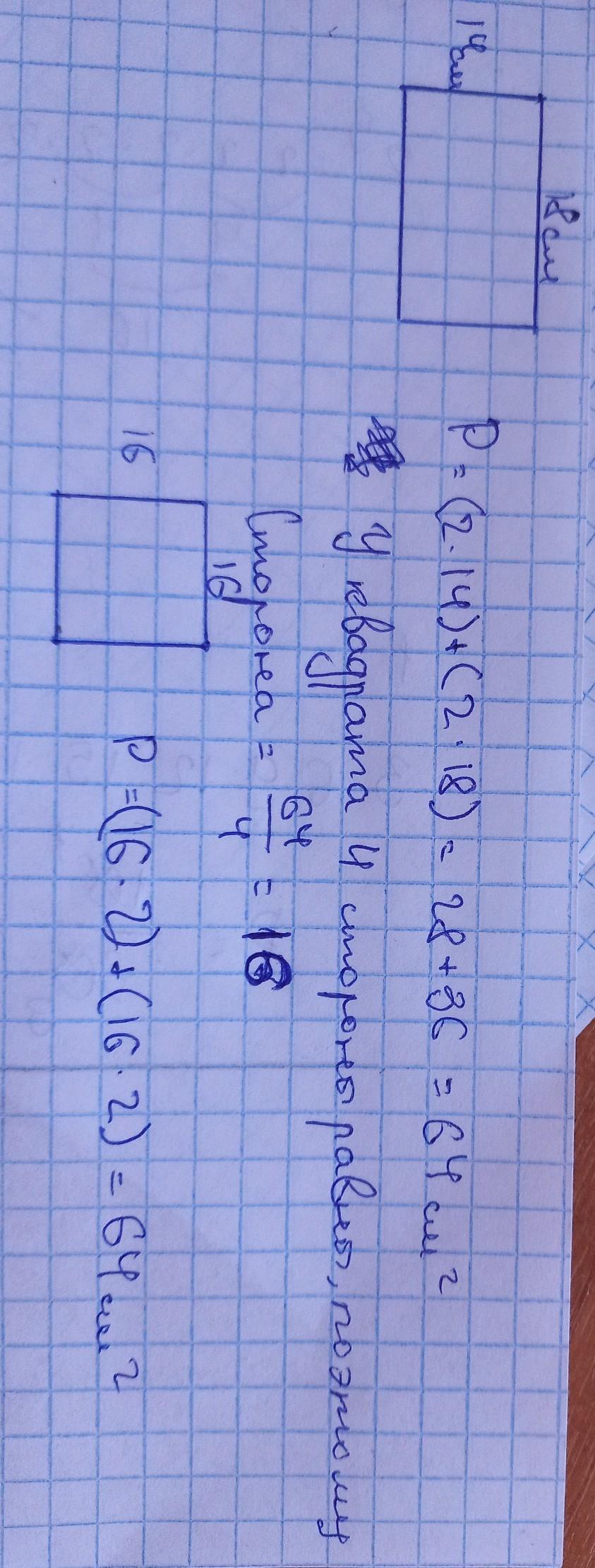 1) (14+18)*2=64(см)-периметр прямоугольника