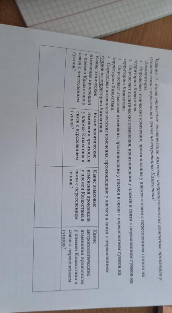 Задание 2. Какие этнические, политические, языковые, антропологические изменения произошли у племена связи с переселением гуннов на территорию Казахстана? Дескрипторы: 1 Определяет этнические изменения, произошедшие у племен в связи с переселением гуннов на территорию Казахстана 2 Определяет политические изменения, произошедшие у племен в связи с переселением гуннов на территорию Казахстана. 3 Определяет языковые изменения, произошедшие у племен в связи с переселением гуннов на территорию Казахстана 4. Определяет антропологические изменения, произошедшие у племен в связи с переселением гуннов на территорию Казахстана. Какие политические Какие языковые Какие изменения произошли изменения произошли антропологические у племен Казахстана в у племен Казахстана в связи с переселением у племен Казахстана в изменения произошли связи с переселением связи с переселением гуннов? у племен Казахстана в гуннов? гуннов? связи с переселением гуннов? Какие этнические изменения произошли