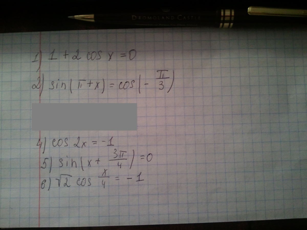 Помогите пожалуйста !!! очень срочно надо... 1)1+2cosx=o; 2) sin(П+х)=cos(-П/3); 3)cos2x=-1; 4) sin(x+3П/4)=0; 5√2cosx4=-1.