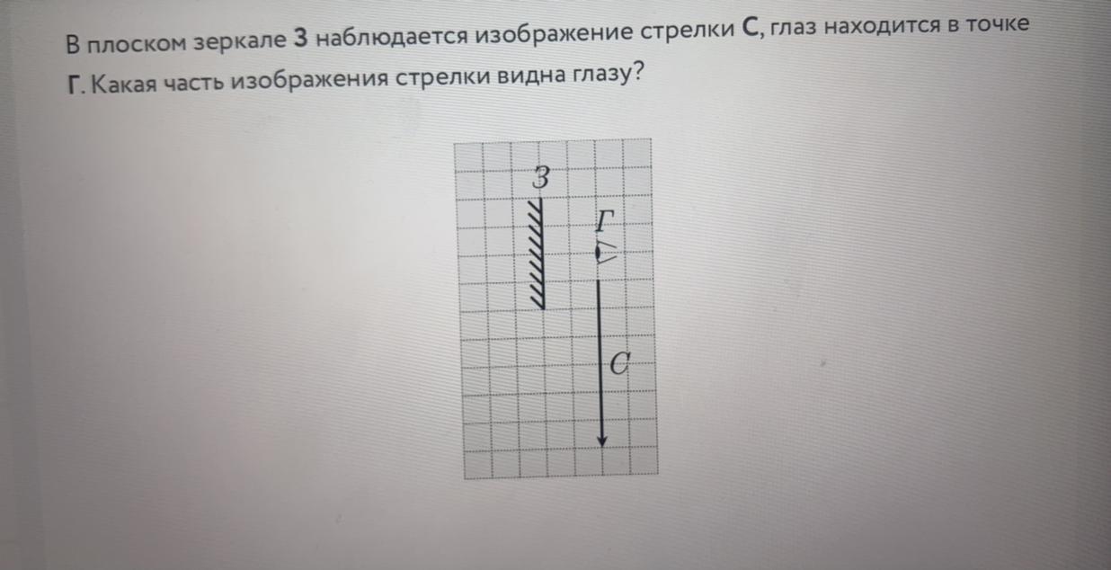 В плоском зеркале 3 наблюдается изображение стрелки С, глаз находится в точкеГ. Какая часть изображения стрелки видна глазу?