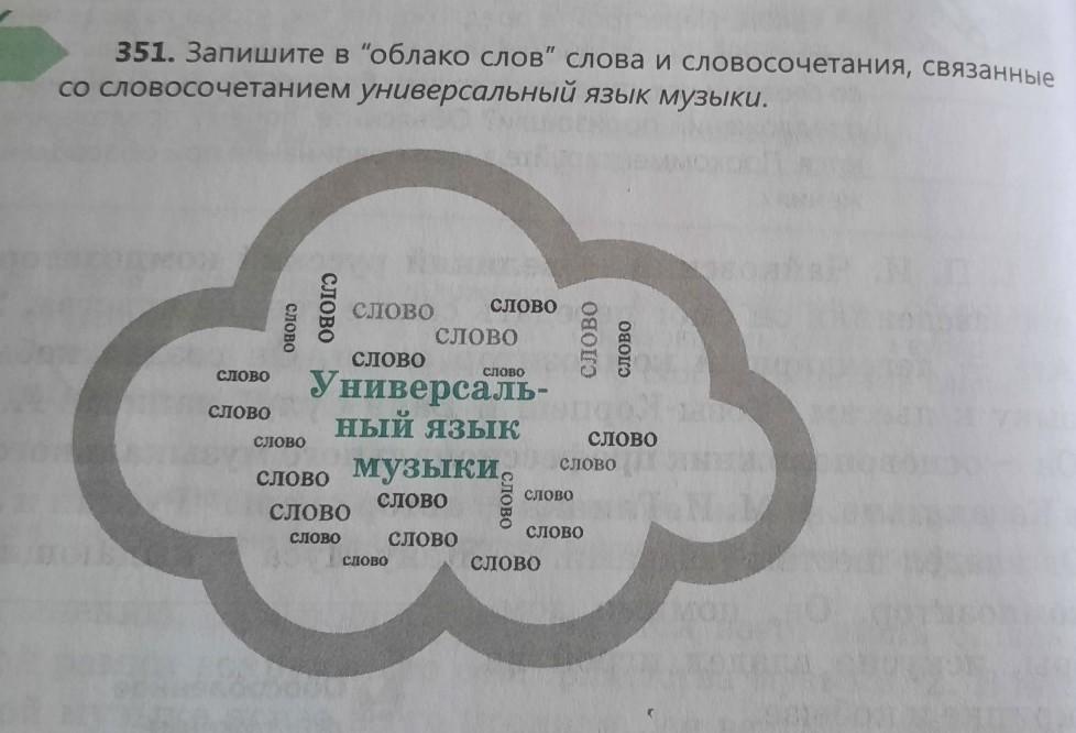 351.Запишите в " облако слов" слова и слов и словосочетания,связанные со словосочетанием универсальный язык музыки